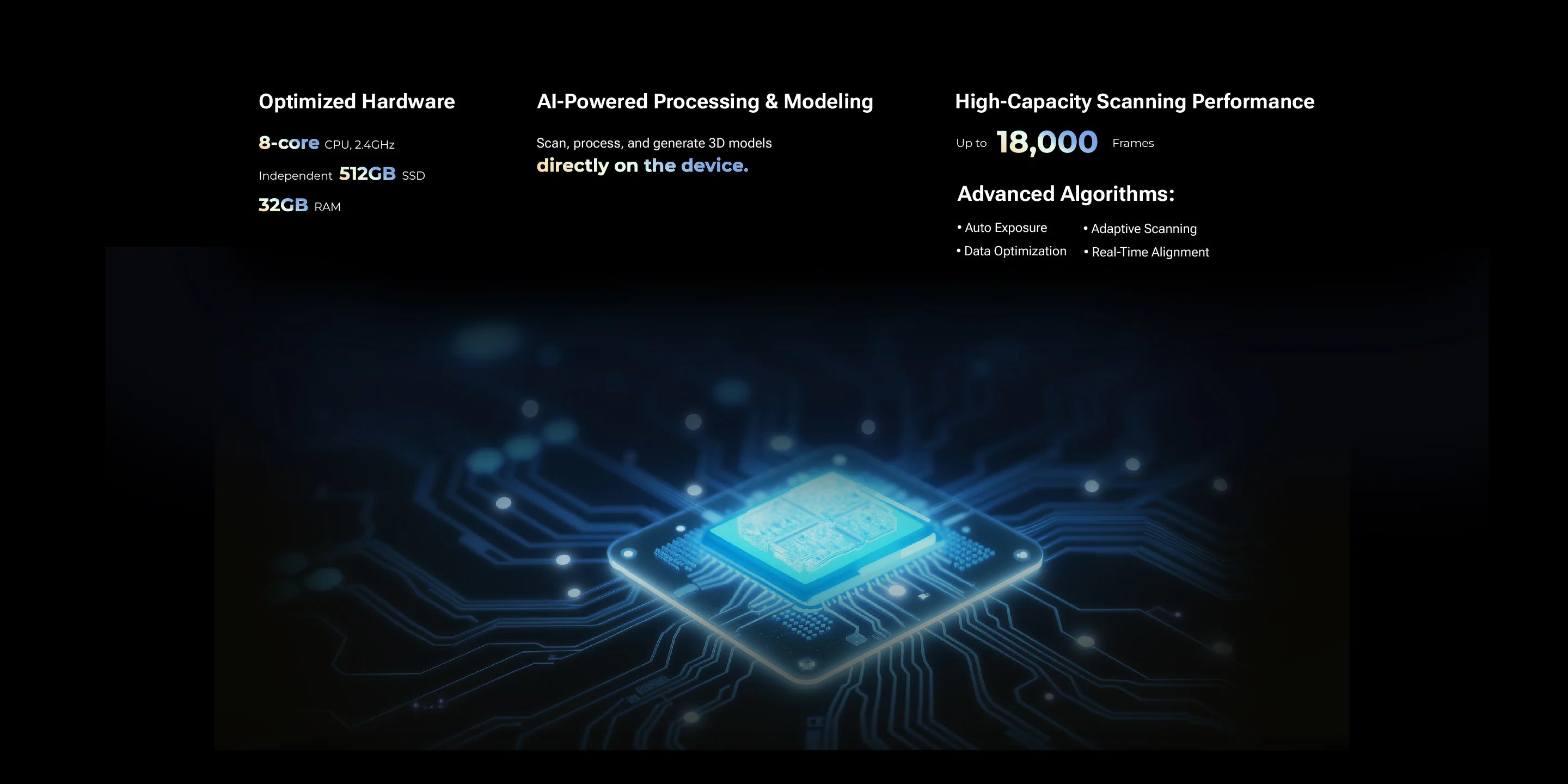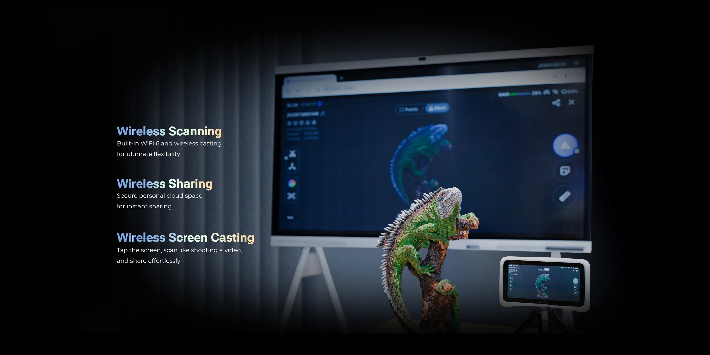 VEGA คือ “Smart 3D Scanning Terminal” ที่รวมสแกนเนอร์ 3D, จอสัมผัส 6.4" 2K OLED และคอม 8-core CPU + RAM 32GB + SSD 512GB ไว้ในเครื่องเดียว สแกนได้ทั้งโหมดละเอียด (HD Mode) และโหมดเร็ว (Fast Mode) ครอบคลุมตั้งแต่วัตถุเล็กจนถึงวัตถุใหญ่ ระยะ 100–1500 มม. รองรับการสแกนกลางแจ้งถึง 100,000 lux และเก็บสีด้วยกล้อง 48MP เหมาะกับงานอุตสาหกรรม, วิศวกรรม, ยานยนต์ และ 3D content ที่ต้องการทั้งความคล่องตัวและคุณภาพระดับโปรในชุดเดียว